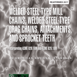 Standard consolidation two asme standards, b29.16m-1995 (welded steel-type mill chains, attachments, sprocket teeth) b29.18m-1993 drag teeth). standards combined one similarity construction usual applications types chains. welded-steel-type chains (b29.16m) developed provide series steel similar cast detachable, mill, combination types. welded chain identical offset links barrels contact teeth, pins articulate links. fixed sidebar pitch holes either press fits and/or mechanical locks , flats, prevent rotation holes. main topics b29.16m (a) assembled chain; (b) disassembled (c) dimensions (d) tooth form. also tables general dimensions, minimum ultimate tensile strength rating, strand length, measuring load checking lengths; maximum controlling interchangeable links; clearance dimensions; a1, a2, a22, f2, f4, k1, k2 w1 attachments; (e) sprockets – eccentricity face runout tolerances; (f) form factors. although welded-steel type introduced many years ago forest products industries, extended usage variety materials handling drive recent stimulated standardization basic (b29.18m) originally industries expanded called sizes. locks, proportions designations; form; design data. barrel cross section; stregth, c1, c3, c4, rr wing-type factors; (g) sprockets: tolerances.   teeth provides configurations attachments teeth.