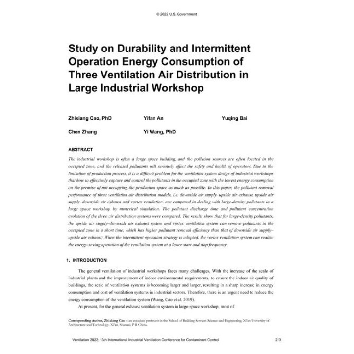 032 -- Study on Pollutant Removal Efficiency of Three Ventilation Air Distribution in Large Industrial Workshop